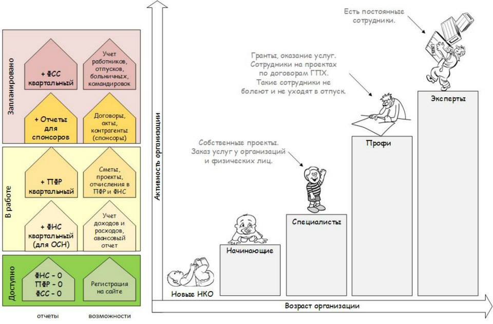 Ведение бухгалтерского учета и подготовка обязательной отчетности – это основная услуга, которая развивается в первую очередь. В то же время авторы готовят новые возможности для ведения проектов и поддержки ежедневных процессов некоммерческих организаций.