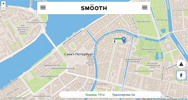 Релиз состоялся в июне 2015 года. Smooth – это приложение, позволяющее пользователю построить маршрут по городу на общественном транспорте или пешим ходом с учетом доступности транспорта и пешеходных зон для людей с ограниченной подвижностью. Код проекта выложен на GitHub.