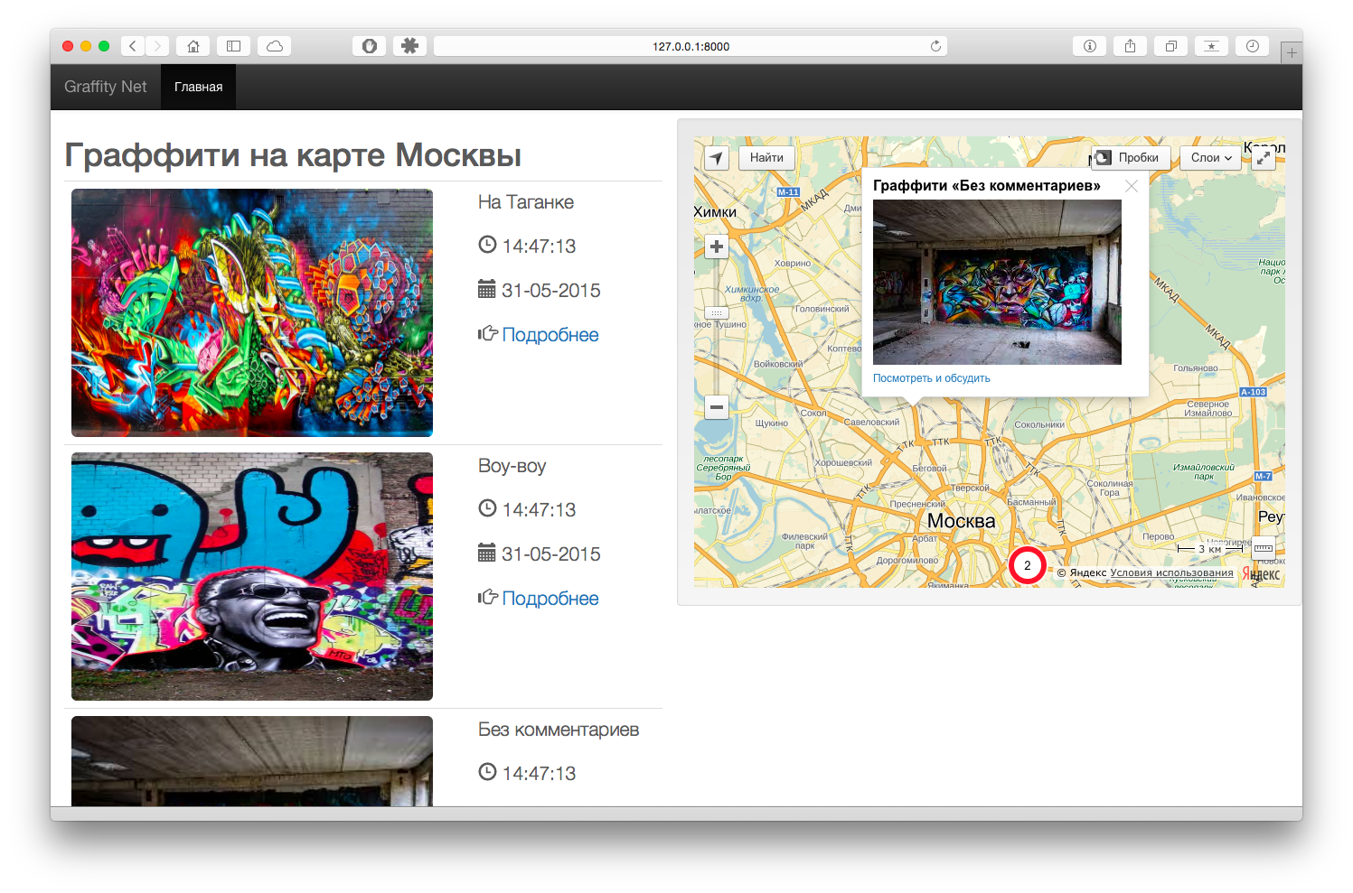 Проект представляет собой веб-сервис для добавления на карту фотографий граффити на улицах города, которые можно комментировать, обсуждать, а также искать граффити рядом с местоположением пользователя.