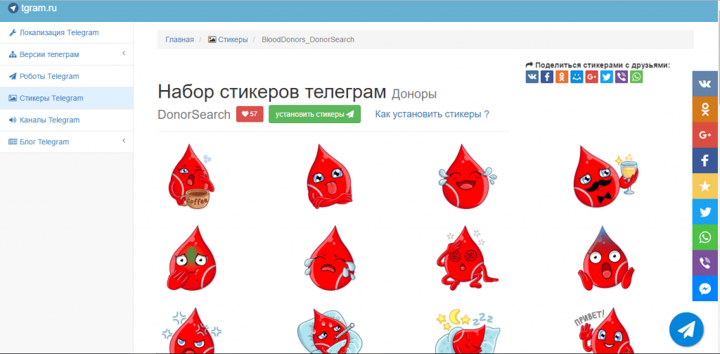 2. Набор стикеров DonorSearch. Руководитель проекта DonorSearch Руслан Шекуров в начале апреля 2017 года запустил свой набор стикеров в телеграм. В наборе 48 стикеров, он представлен в виде истории: ее герой — капелька, которая сдает кровь.