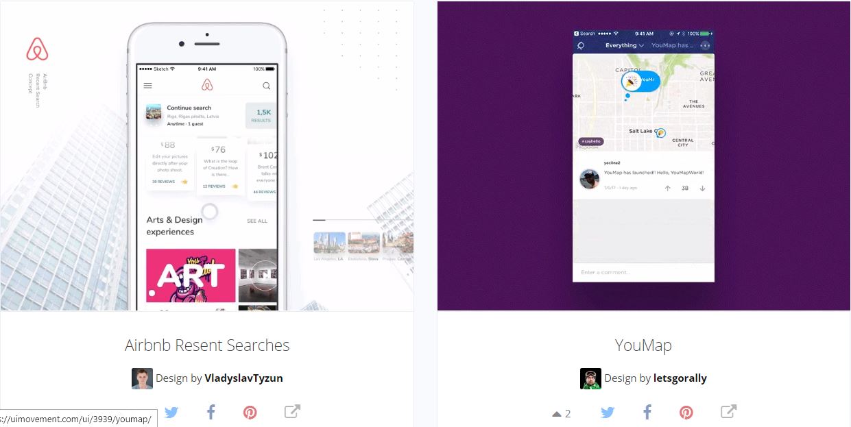 Сайт- библиотека готовых успешных интерфейсов. Информацию можно найти по 33 категориям: пользовательские вкладки, экраны, списки, навигация, профили, поиск, настройки, визуализация, кнопка «войти», заставки, домашняя страница. В каждой категории опубликованы шаблоны интерфейсов различных компаний и приложений.