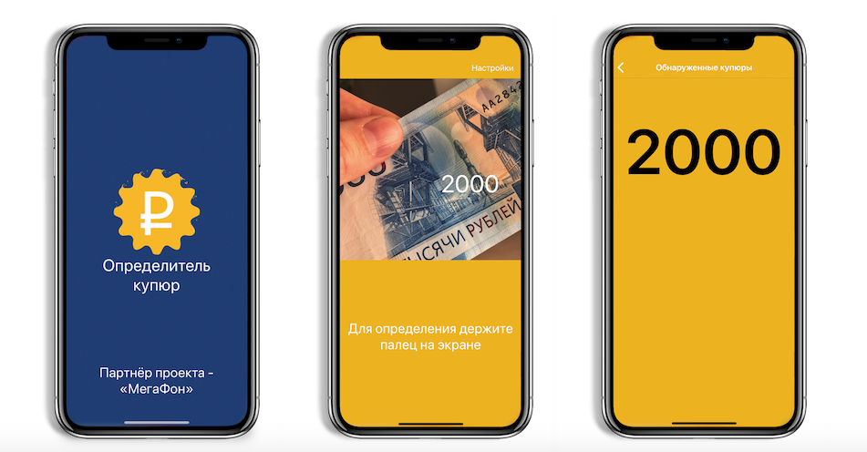Например, команда «Сенсор-тех» создала приложение, которое позволяет незрячему человеку определить номинал купюры. Незрячие и слепоглухие люди пользуются смартфонами, для этого они используют специальный голосовой режим, когда все действия на экране озвучиваются. С таким приложением им достаточно навести телефон в сторону купюры и через доли секунды они услышат номинал банкноты – 200 рублей, 500.