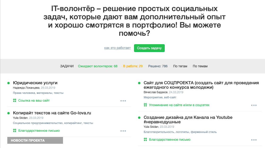 Например, платформа It-волонтер. Если вашей организации нужна помощь программиста, дизайнера, журналиста, копирайтера или фоторедактора, вы можете зарегистрироваться на платформе и создать задачу. Укажите, как вы готовы отблагодарить специалиста. Предложите, например, разместить ссылку на его профиль или компанию у себя на сайте. Кстати, есть вероятность, что он также расскажет о вашей организации и той работе, которую он для вас выполнил.