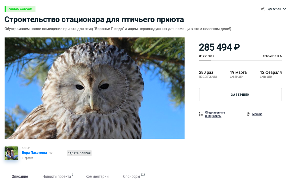 Краудфандинговый проект Веры Пахомовой на Planeta.ru по строительству московского стационара для птичьего приюта собрал 285 тысяч рублей чуть больше чем за месяц. Эта история сразу нас зацепила. Живой текст и необычная подача заметно выделяли проект среди других. Сбор успешно завершился. А через несколько месяцев по счастливому стечению обстоятельств Вера Пахомова присоединилась к команде «Планеты».
