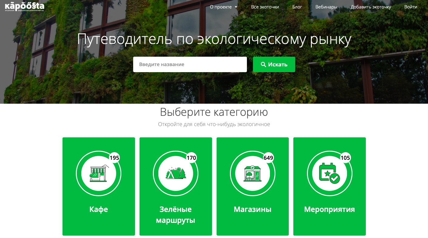 Экологический гид движения «ЭКА». Для тех, кто хочет найти самые разные «зеленые» объекты – экомагазины, вегетарианские кафе, шеринг-проекты и даже маршруты для прогулок. Удобный сервис для тех, кто в одном месте хочет найти самые разные экоточки, стать волонтером или выбрать партнеров. Пользователи могут сами добавлять места и проекты на карту. Для этого надо прислать ссылку на экоточку в обсуждение.