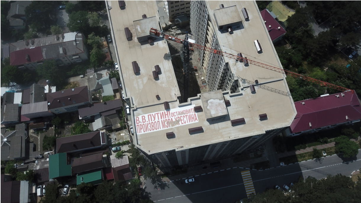 «На баннере написано «В.В. Путин! Останови произвол мэра Хрестина». Просто Путин часто летает здесь на вертолете, у него под Геленджиком в лесу резиденция. Там летать я не рискую. Но вся эта история понятна только после объяснений. Эту надпись практически невозможно снять с рук, а вертолета и незаконной дачи под Геленджиком у меня нет. Зато у меня есть дрон. И кадр, сделанный с его помощью, попал в фильм, который мы снимали. В отличие от непонятной без дополнительных объяснений фотографии». Александр Савельев