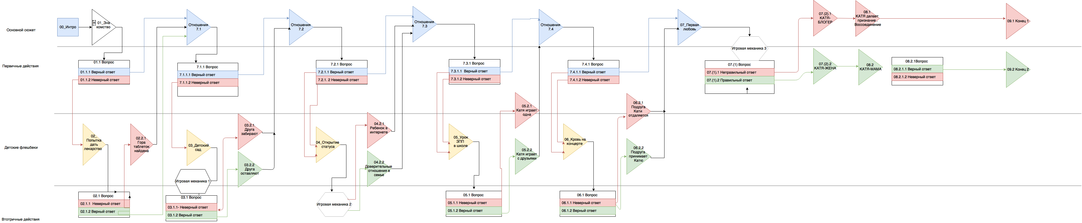 Ветвящиеся интерактивы с множеством сюжетных линий – это сложные с технической и сценарной точки зрения проекты. Поэтому создание сериала #ВсёСложно Антон Уткин и Ната Покровская начали с gameflow – построения всех сюжетных линий и вариантов развития истории. Основные события #ВсёСложно происходят в настоящем. Героиня встречает молодого человека, и сюжет развивается только вокруг того, будут они вместе или нет. Когда зритель делает тот или иной выбор, ему показывают предысторию Кати и то, через какие жизненные ситуации ей пришлось пройти.