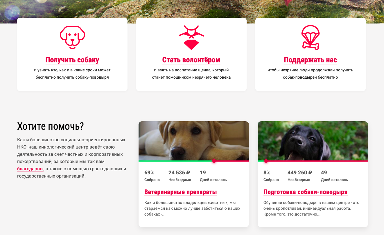 В основу обновленного сайта легли два принципа: легкость поиска информации и возможность удобно сделать пожертвования. Команда «Совы» предложила размещать на главной странице две акции по сбору средств. Один из них небольшой целевой − в данный момент это сбор на покупку ветеринарных препаратов для щенков и собак. И один крупный – на стратегическую задачу центра. Например, такую как подготовка новых собак-поводырей.