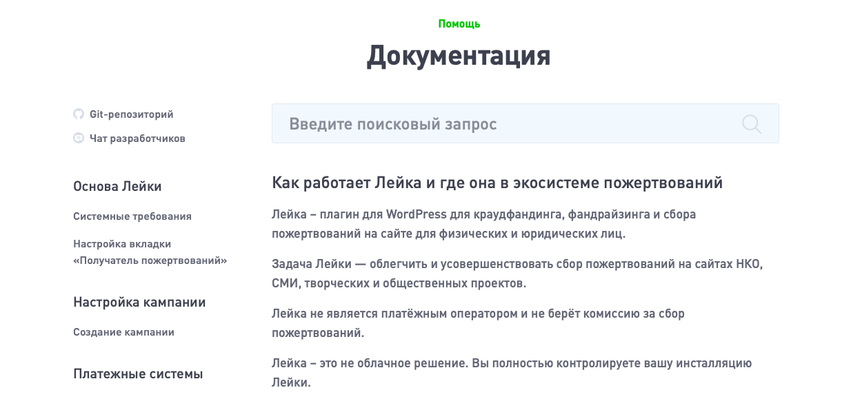 Для тех, кто уже давно пользуется «Лейкой», был обновлен раздел с документацией: появился рубрикатор и поиск.