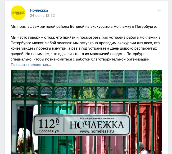 История с открытием приюта благотворительной организации «Ночлежки» в Москве длится второй год, и запуск проектов дается команде непросто. Новый филиал – всегда большое и трудоемкое дело, но именно в этой истории много нюансов. О том, как запуск проектов «Ночлежки» в Москве стал историей коммуникации с провалами и успехами, Теплице рассказала Мария Калинкина, специалист по SMM организации.