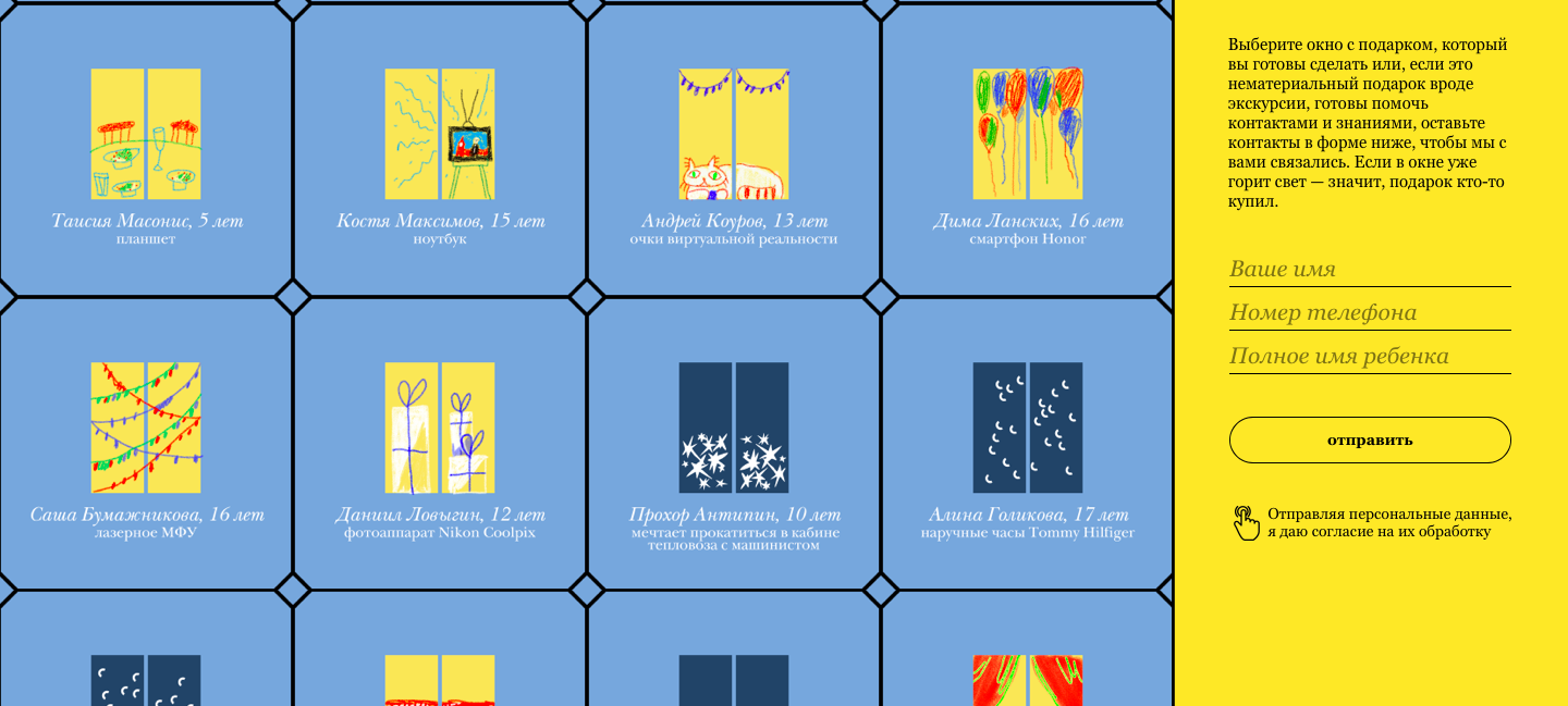 Еще одну интерактивную праздничную онлайн-акцию «Включите свет!» запустил Фонд Ройзмана. На странице проекта можно посмотреть подарки, которые хотят получить дети на Новый год. Чтобы выбрать желание, пользователи должны навести курсор на темное окно и посмотреть информацию. Если в окне уже горит свет, значит, желание ребенка исполнено. Купить подарок благотворители могут самостоятельно или пожертвовать часть суммы. Акция проходит в третий раз, но только в этом году впервые была запущена в интерактивном формате.