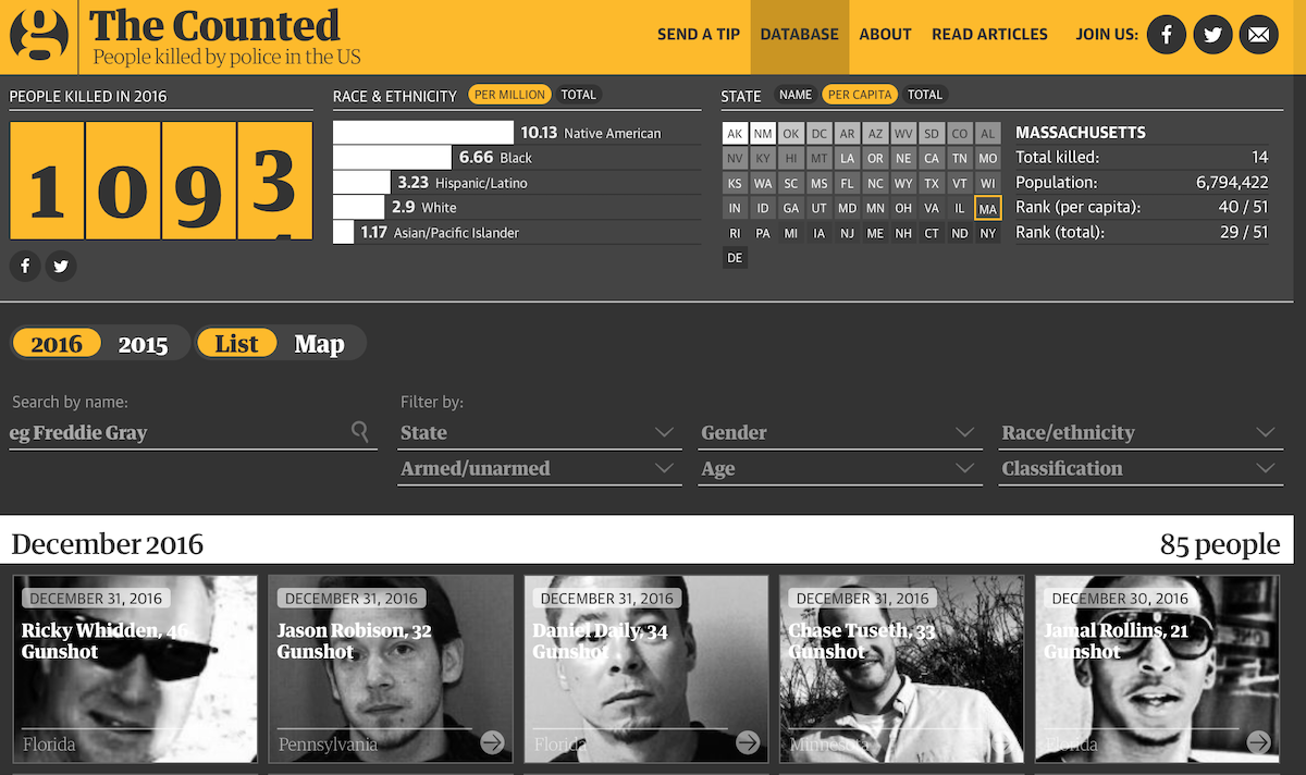 Команда The Guardian собрала свою собственную базу данных смертей, связанных с деятельностью полицейских в США в 2015 и 2016 годах. При ее составлении они мониторили местные новости, звонили в морги, организовали форму, через которую все желающие могли отправлять им подсказки. Они также обращались к таким уже существовавшим краудсорс-инициативам по сбору данных о полицейском насилии, как проекты Killed by the Police и Fatal Encounters. Вокруг The Counted образовалось целое сообщество людей, небезразличных к теме полицейского насилия. Как итог, журналистам удалось собрать базу данных, рассказать множество историй погибших людей и написать ряд статей о проблемах полицейского насилия и американской статистики по этому вопросу.