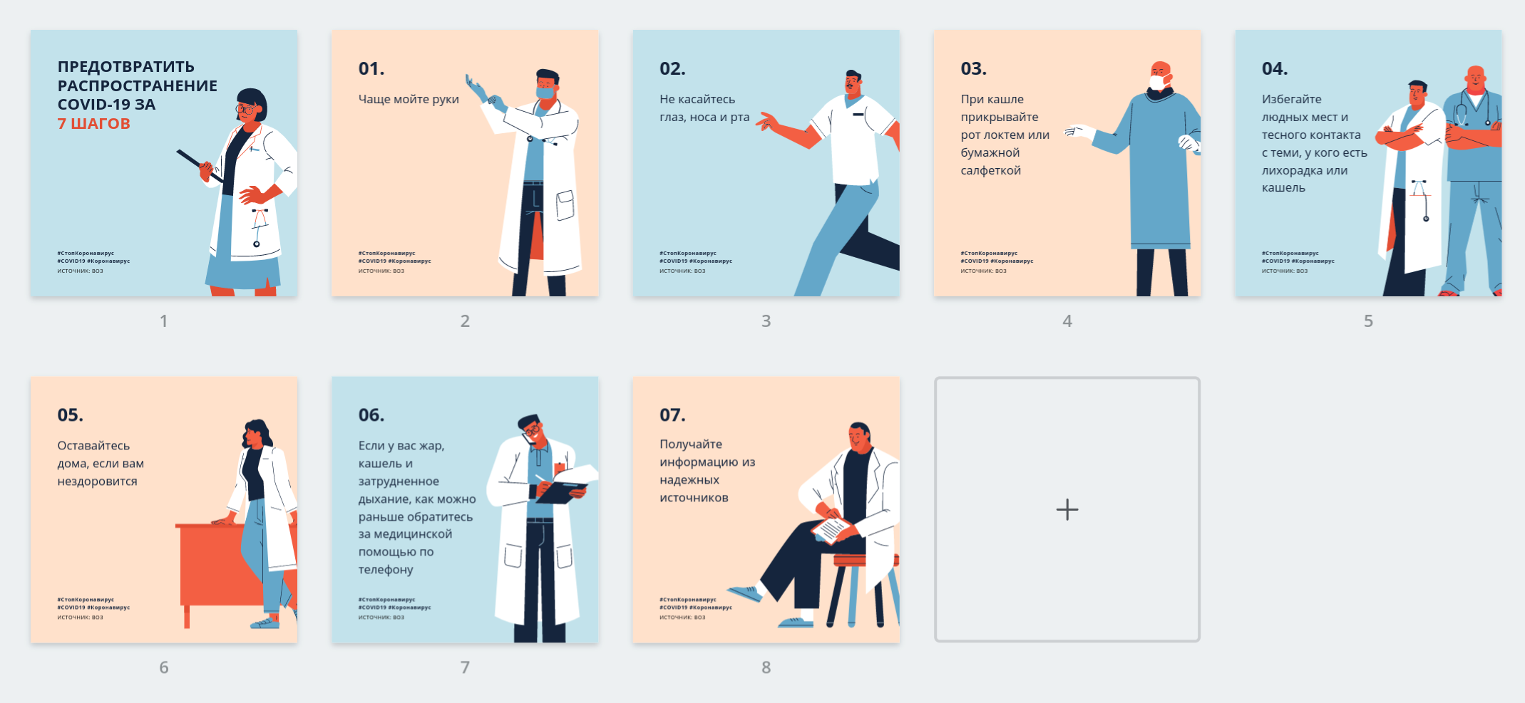 Таким образом организации получили доступ ко всем инструментам Canva, включая Magic Resize. Кроме того, команда дизайнеров Canva вызвалась помочь всем организациям с созданием любого дизайна, который им требуется, а также выпустила более 100 шаблонов, связанных со здоровьем.