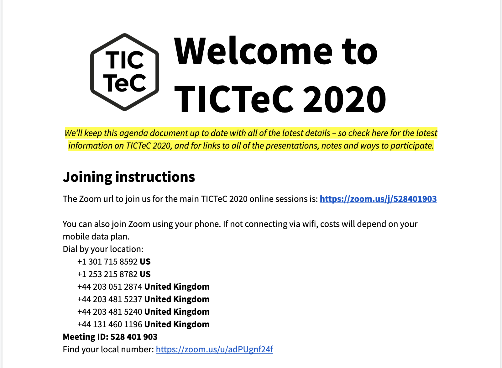 Сейчас очень много говорится и пишется о переводе мероприятий и коллективной работы на удаленный формат. И вот опыт конференции TICTeC является хорошим примером. Организационно конференция была устроена очень прозрачно и удобно: для всех желающих было открыто расписание в Google Docs со всеми нужными ссылками, были папки с коллективными заметками и презентациями. Для того чтобы послушать представителей некоммерческих организаций и активистов со всего мира, уже не надо платить регистрационный взнос и ехать в Рейкьявик.