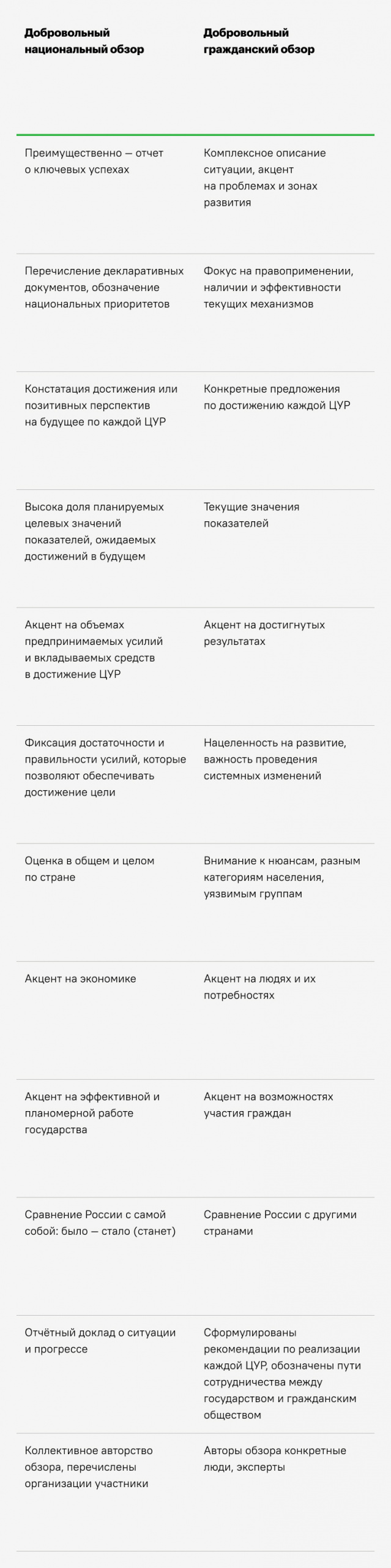 В кратком виде ключевые различия двух типов обзоров по ЦУР представлены в таблице ниже.