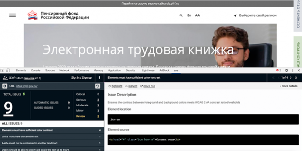 Axe – это плагин для браузера Chrome. Результат его работы с сайтом Пенсионного фонда тоже показателен: