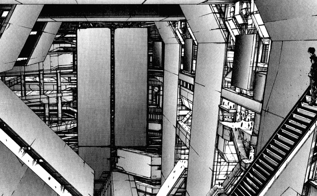 BLAME! — это масштаб. Место действия — Город, разросшийся так, что в нем есть полость выработанного для строительства материала, которая раньше была Луной. И это далеко не самая большая структура внутри существующей Мегаструктуры. Выражается это не только визуально. Вот, например, один из моих любимых эпизодов: в пути главный герой (его зовут Килли) подобрал «флешку» с чьим-то сознанием, сейчас она висит у него на шее. Перед очередной лестницей между ними происходит диалог: