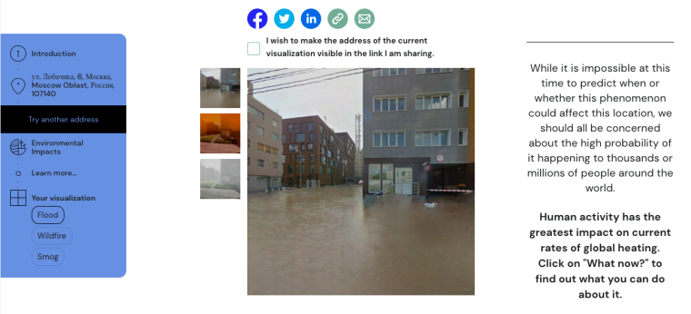 Создатели проекта призывают пользователей делиться полученными изображениями. Также на сайте есть еще одна интересная функция. Созданную визуализацию можно отправить себе на почту и выбрать время, когда электронное письмо будет доставлено: сразу же, через три месяца или через полгода. Это дополнительная возможность напомнить людям, что изменение климата — проблема, с который может столкнуться каждый.