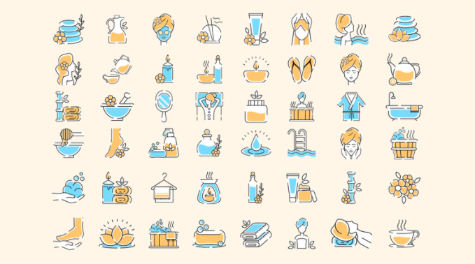 Набор из 48 иллюстрированных иконок отлично подойдет для презентации услуг салона красоты или SPA-комплекса. Их можно использовать и для соцсетей, например, в оформлении Instagram.