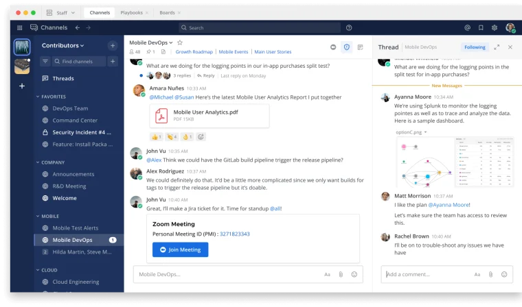 Mattermost предоставляет возможность хранить все данные, чаты и файлы на собственных серверах. Оба варианта предлагают как бесплатные, так и платные тарифы с разными условиями — например, бесплатный Slack предоставляет только 5 Гб хранилища и предполагает ограничения по поиску сообщений (пользователи могут выполнять поиск только по 10 000 последних сообщений), а бесплатный Mattermost можно использовать только на собственных серверах, что может потребовать понимания, как работают серверы.