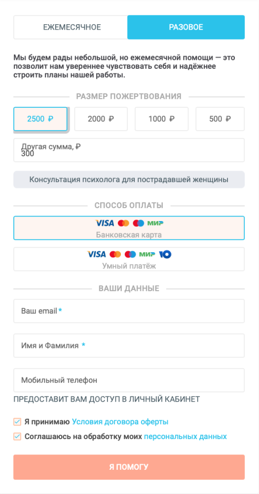 В конце 2021 года наша команда обратилась к Теплице с предложением сделать надстройку к «кнопке», которая позволяла бы сразу добавлять информацию о ценностном предложении (Value Proposition), то есть рассказать, как пожертвование помогает решить ту или иную задачу. Например, 1000 руб. поможет оплатить такси для экстренной эвакуации женщины, пострадавшей от насилия. И донорам теперь понятнее и проще решить, на что именно пожертвовать.