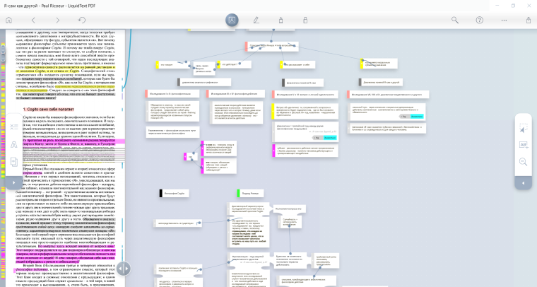 При работе над этой схемой я параллельно вела схематические конспекты в другом приложении — LiquidText, но оказалось, что оно не позволяет вытащить наработки в том виде, который позволяет создавать mindmap со связями между цитатами, поэтому я со спокойной совестью перевела этот процесс в Miro.