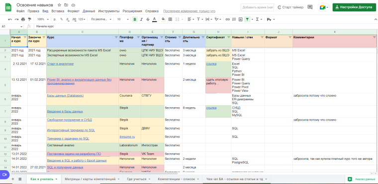 В университете я освоила Google-таблицы. Уже во время работы в том же университете на административной должности я из интереса пошла на курсы по Excel, но и этого мне было недостаточно. Мой подход к тому, что можно было бы назвать архитектурой знания, перевернул онлайн-курс по системному мышлению на Coursera (правда, теперь платформа удалила курсы российских университетов, в том числе и этот). Такой курс отлично переворачивает взгляд на мир, если ты гуманитарий, а я по образованию культуролог.