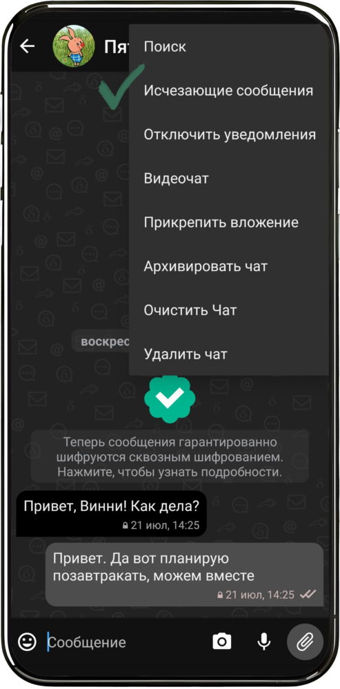 - Поставить таймер на регулярное автоудаление сообщений из приложения и с сервера, что мы настоятельно рекомендуем сделать;
