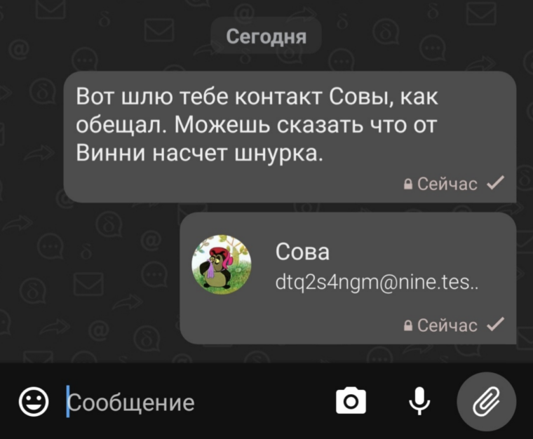 Вы также можете передать контакт одного пользователя другому, просто прикрепив его к сообщению как вложение (иконка «скрепочка»):