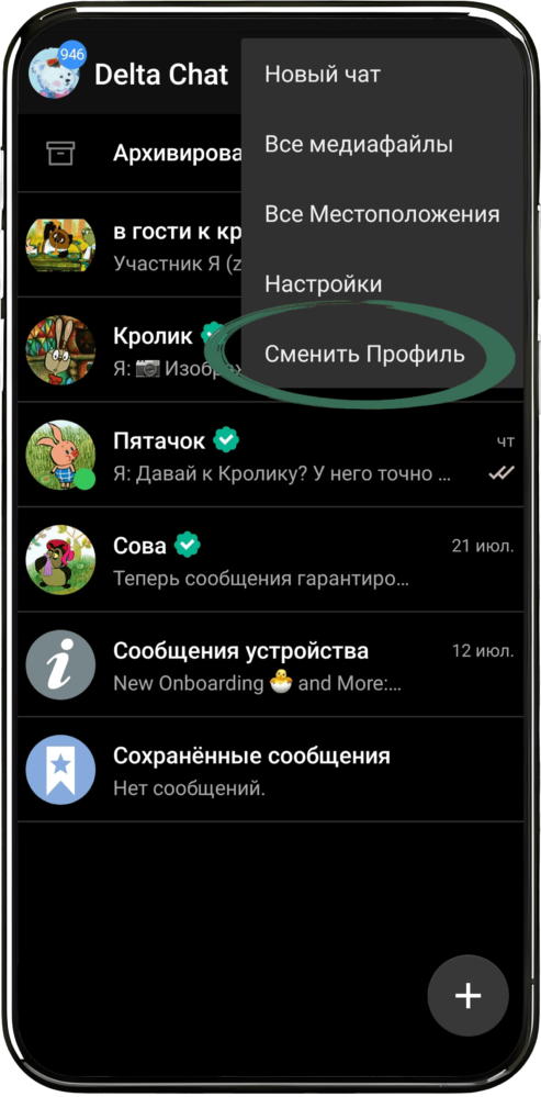 Delta Chat даёт пользователям возможность создавать множество профилей для разных задач и быстро переключаться между ними без необходимости разлогиниваться.