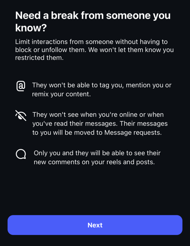 ✔ Функция Restrict (Ограничить). Она полезна, когда не хочется дарить хейтеру радость открытого блокирования (часто они создают новый аккаунт и лезут с еще большим усердием). Если вы нажимаете «Ограничить» на профиле, то комментарии этого человека будут видны только ему самому (и вам – если откроете их вручную). Остальные ваши подписчики их не видят. А сообщения от ограниченного пользователя приходят как запросы, без уведомлений. Такой «тихий бан» остужает пыл многих троллей.