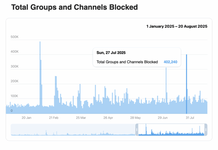 Отчет службы модерации Telegram о заблокированных за нарушения чатах и каналах за 2025 год; весь мир.