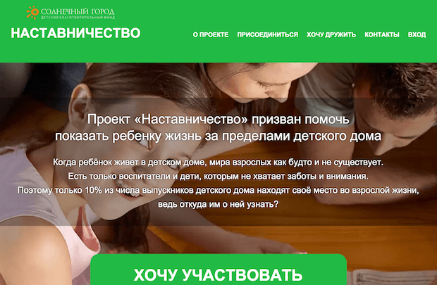 Волонтеры проекта «Наставничество» проводят индивидуальное сопровождение воспитанников детских домов детского благотворительного фонда «Солнечный Город» в Новосибирске. Для проекта был запущен отдельный информационный сайт.