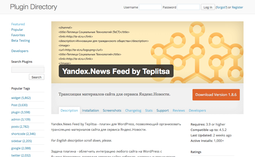 Плагин для WordPress позволяет организовать трансляцию материалов сайта для сервиса Яндекс.Новости, облегчает интеграцию сайта. У плагина уже более восьми тысяч активных установок.