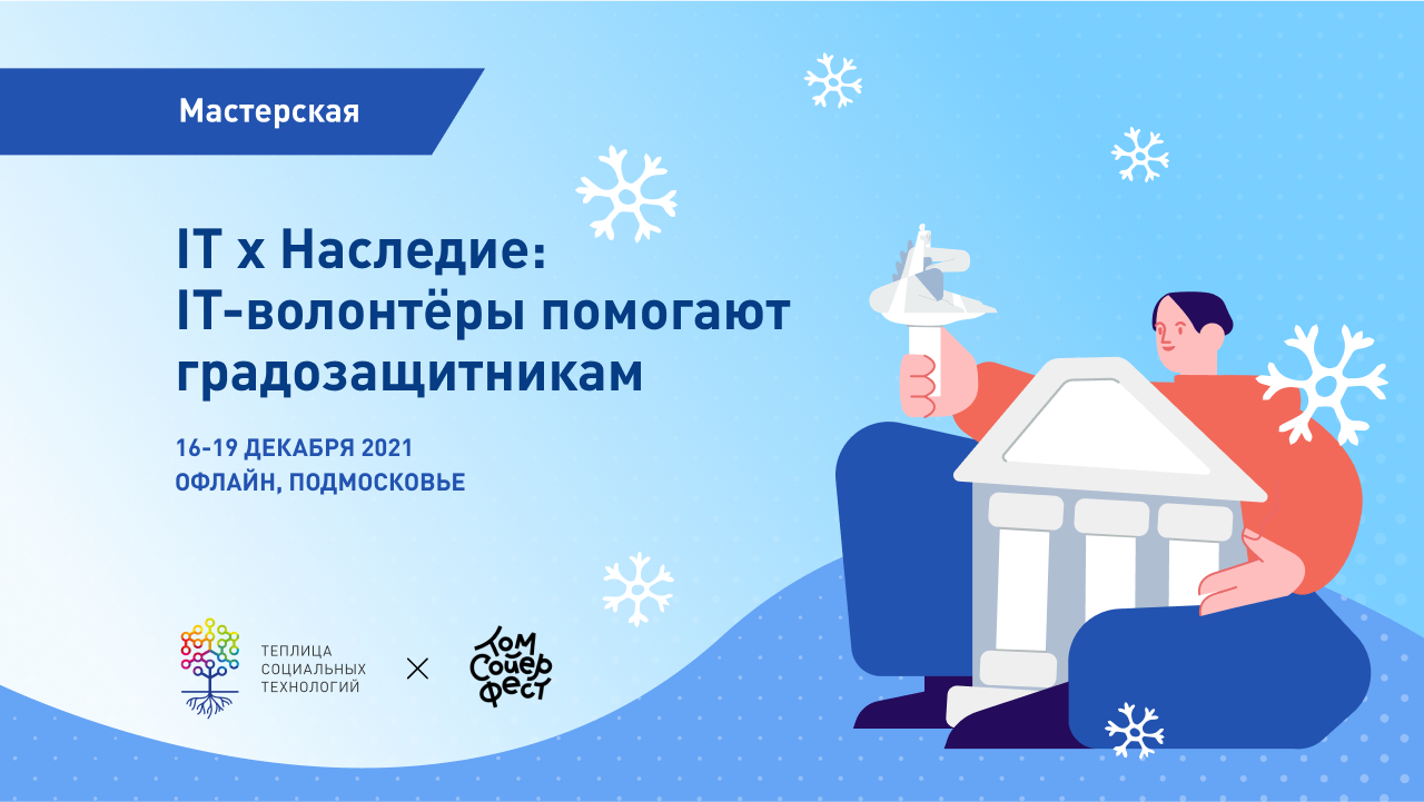 Команды Теплицы социальных технологий и «Том Сойер Феста» приглашают градозащитников принять участие в мастерской «IT X Наследие: IT-волонтеры помогают градозащитникам», которая пройдет офлайн 16-19 декабря 2021 года в Подмосковье.