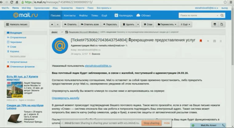 С целью ввести пользователя в заблуждение ему сообщают, что его почтовый ящик будет заблокирован в связи с поступившей на него жалобой. Подпись — «Администрация mail.ru», в конце подписи — логотип, сообщение отмечено как важное. В теле письма — кликабельная ссылка «опровергнуть жалобу». Если нажать на нее, открывается страница, где уже введена почта и надо только ввести пароль. Таким образом злоумышленники и захватят эти данные.