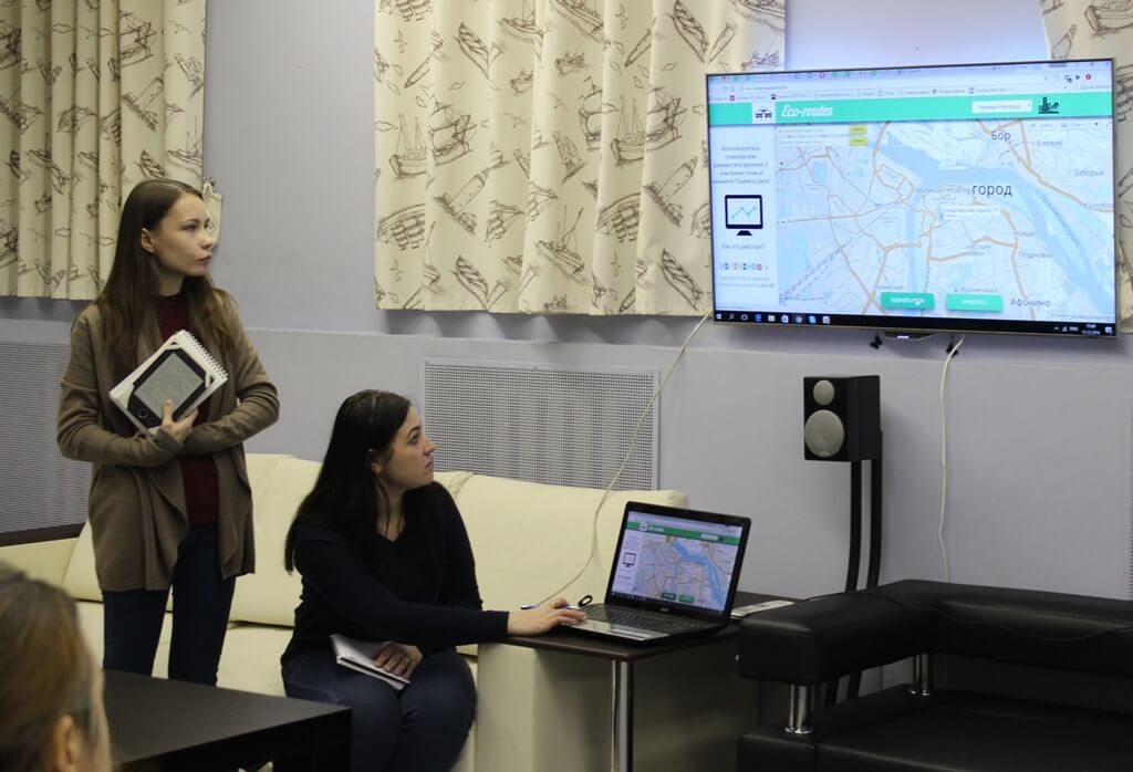 Ирина и Юлия продемонстрировали, как пользоваться сервисом, проложив несколько маршрутов, и рассказали о том, как планируется развивать Eco-routes дальше. Кроме сайта, будет создано специальное приложение и также планируется расширить географию проекта: сейчас сервис охватывает Нижний Новгород, Москву и Екатеринбург.