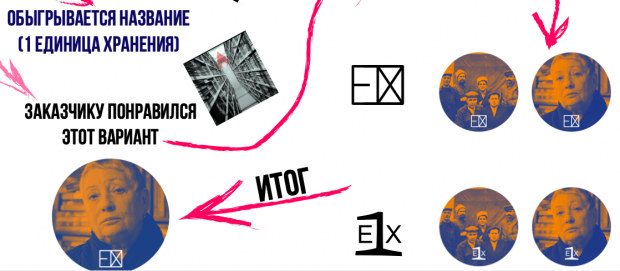 «Вот что у них изначально было, просто буква Р на синем фоне. С помощью моих новых друзей мы набросали эскизы, где обыгрывалось название ЕХ – единица хранения. Этот вариант больше всего понравился заказчику, и мы решили его доработать и сделать менее угловатым».