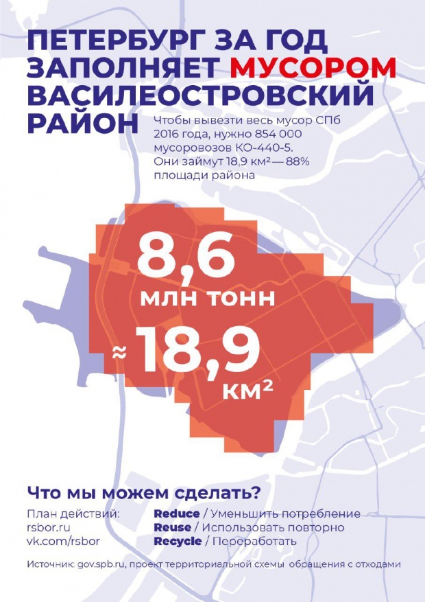 «У меня было несколько идей, и мы решили показать, как город (плакаты будут размещать в в Питере будут вешать плакаты) будет заваливать мусором. Есть данные, что за 2016 год Питер произвел 8,6 млн тонн мусора. Нужно было эту цифру превратить в площадь, и мы решили измерять этот объем грузовиками».