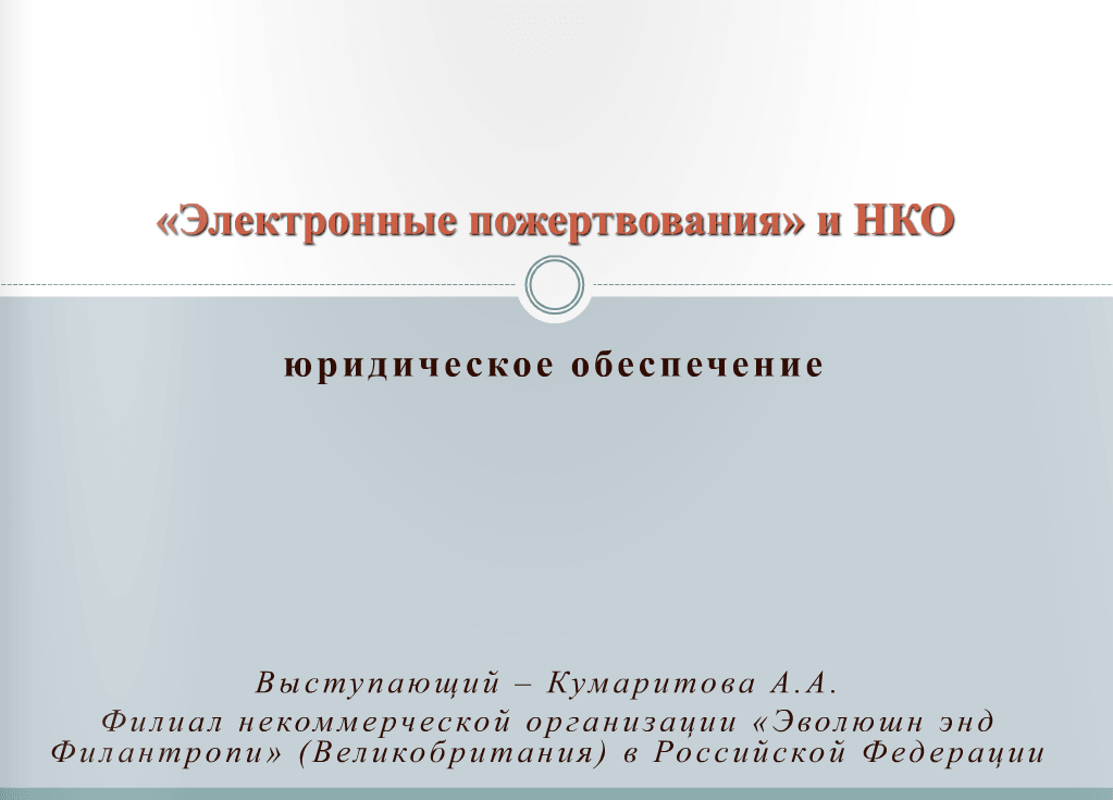 Конференция «Краудфандинг в России», которую Теплица социальных технологий проводила в ноябре 2012 года в Москве затрагивала юридические вопросы, налогообложение и правомерность сбора средств онлайн для НКО. Об электронных пожертвованиях НКО рассказала Анастасия Кумаритова