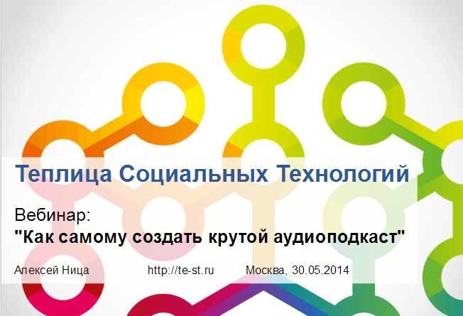 30 мая 2014 года Алексей Ница, автор видеоуроков портала «Теплица социальных технологий», провел вебинар «Как создать аудиоподкаст самостоятельно».