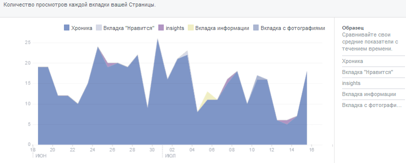 Раздел «Посещения» сегодня теряет свою актуальность. Эта метрика отображает, в какие подразделы вашей страницы чаще всего заходят пользователи: хроника, фотографии, информация о вас. Раньше администраторы страниц настраивали верхнее табло меню для пользователей, и это пользовалось спросом, но сегодня преобладает чтение текущих новостей («хроника») без остановки на структуре вашей страницы.