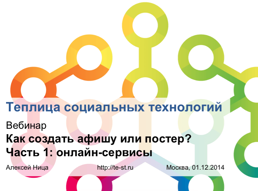 1 декабря прошел вебинар «Как создать афишу или постер? Часть 1: онлайн-сервисы», цель которого – рассказать об интернет-сервисах и о том, как самостоятельно сделать эффективную афишу, которая привлечет людей или компании к вашему мероприятию, как в социальных сетях, так и в распечатанном виде.