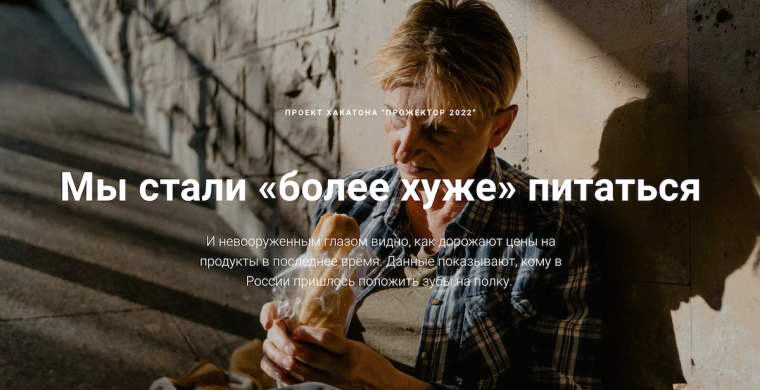 Команда работала над поиском альтернативного индикатора неравенства регионов и остановилась на теме качества питания россиян. Участники сопоставили динамику цен и количество потребляемых продуктов с доходами россиян и долей трат на продукты. В итоге получился лендинг с большим количеством графиков, основанных на анализе различных массивов данных.