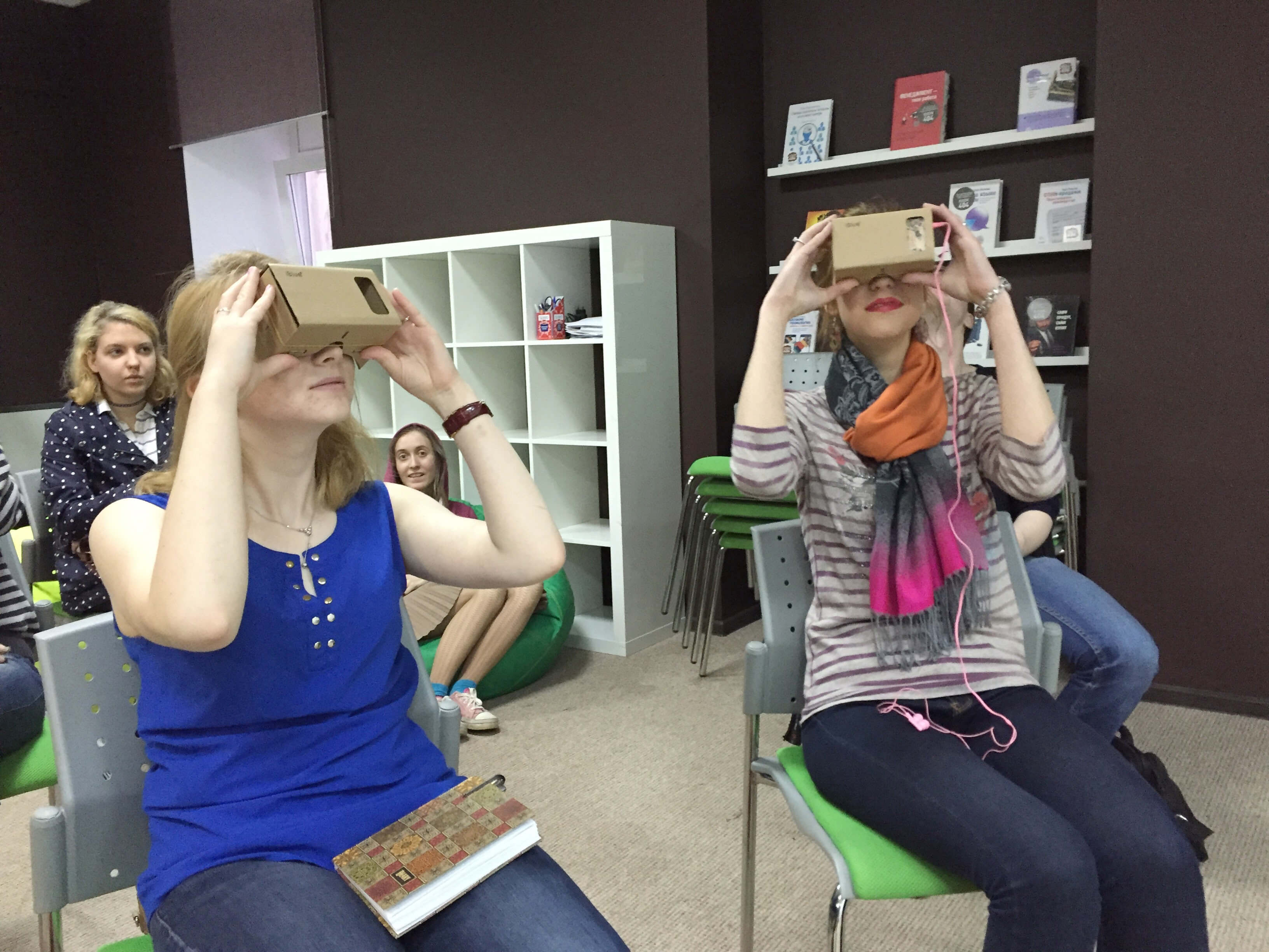 Каждый участник митапа смог погрузиться в виртуальный мир, примерив очки Google Сardboard. Они прогулялись по городу с помощью приложения Google Карты (Android, iOS) и погрузились в историю детей, которые потеряли свои дома из-за войны, – сюжет Displaced.