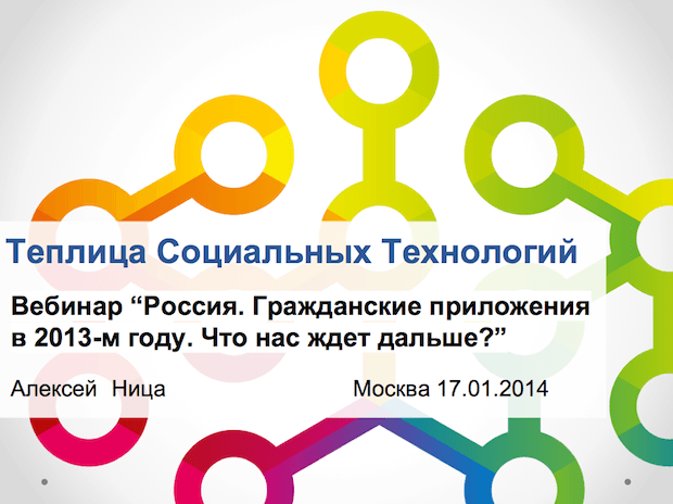 17 января (2014) Алексей Ница, автора сайта «Теплица социальных технологий», провел вебинар «Россия. Гражданские приложения в 2013 году. Что нас ждет дальше?». Вебинар был посвящен обзору наиболее полезных гражданских приложений, которые НКО и гражданские активисты создали и использовали в 2013 году. Предлагаем вам материалы с этого мероприятия.