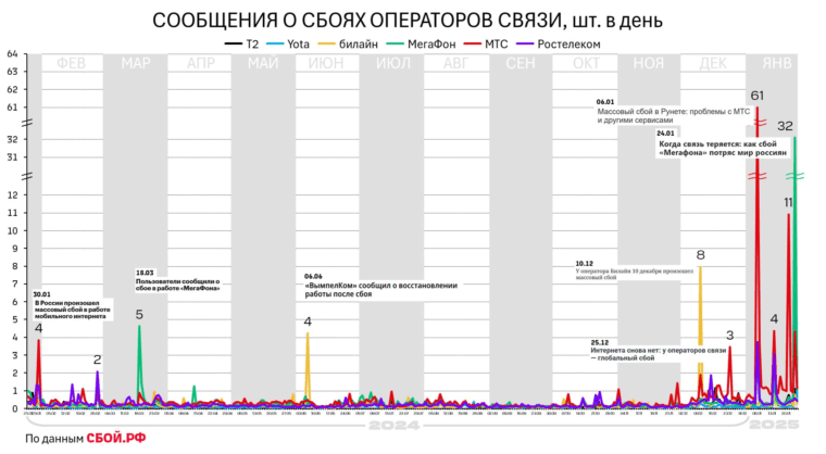 Телеграм-канал «Липовый Рунет» пишет: «И если первый массовый сбой затронул только абонентов МТС, то второй, случившийся в середине января, и третий, произошедший спустя полторы недели, доставили неприятностей россиянам по всей стране независимо от их сотового оператора».